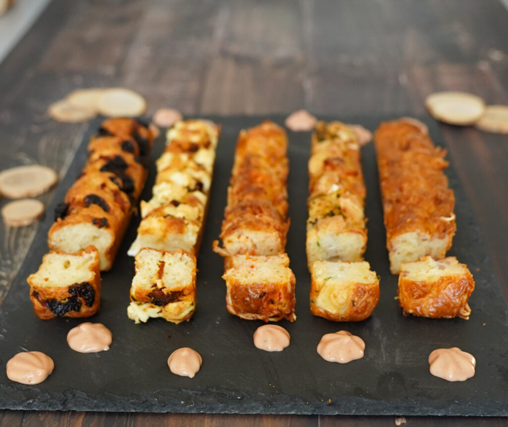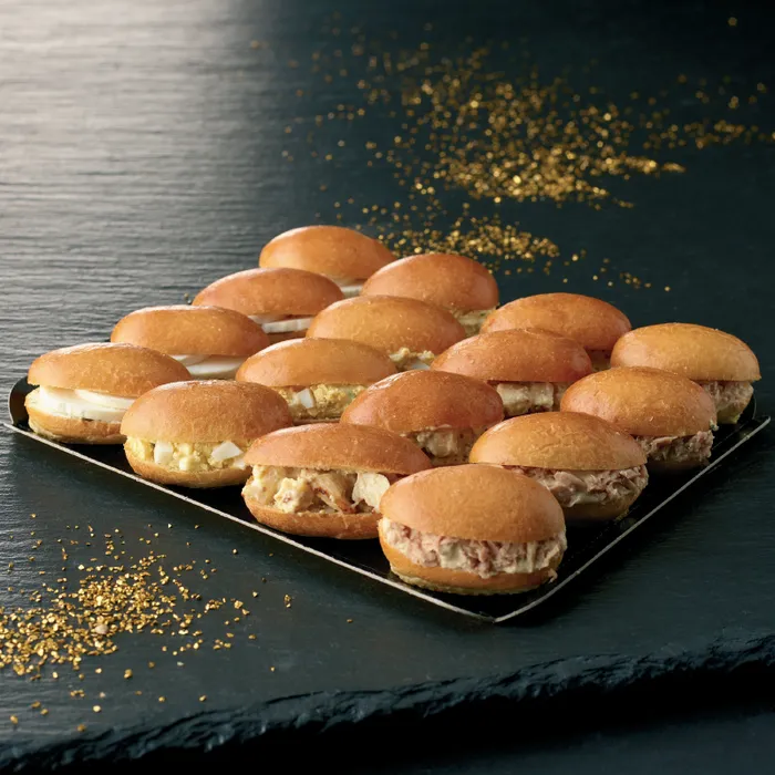 Un assortiment généreux de mini sandwichs réalisés avec du pain de mie ou pain suédois, garnis de recettes variées et savoureuses : tzatzíki-jambon-fromage frais, saumon citron-aneth-fromage frais, thon-mayonnaise, et foie gras accompagné de confit de figue et oignons. Décorés avec soin, ces pains surprise apportent élégance et gourmandise à vos prestations.