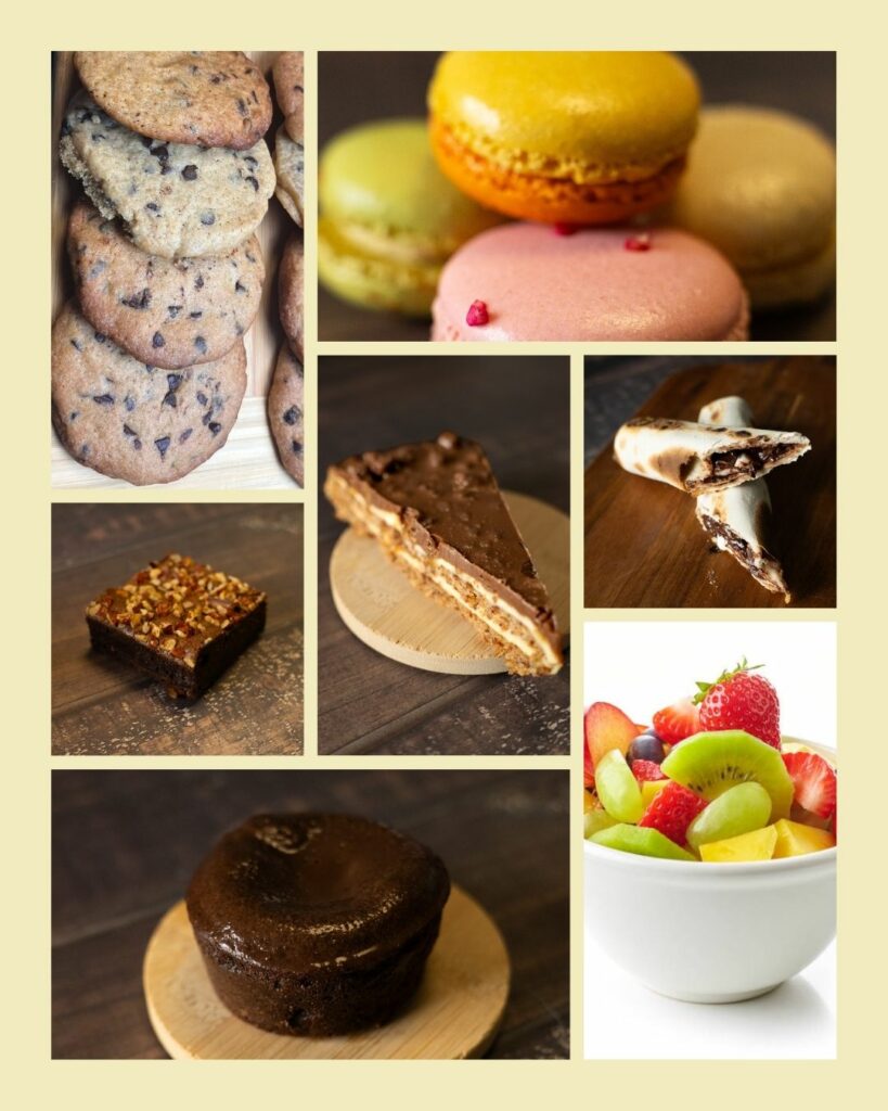 Un assortiment de douceurs vous est proposé : des desserts légers et crémeux, des gourmandises chocolatées, une touche de fraîcheur fruitée ainsi que des pâtisseries généreuses, de quoi satisfaire toutes les envies sucrées.