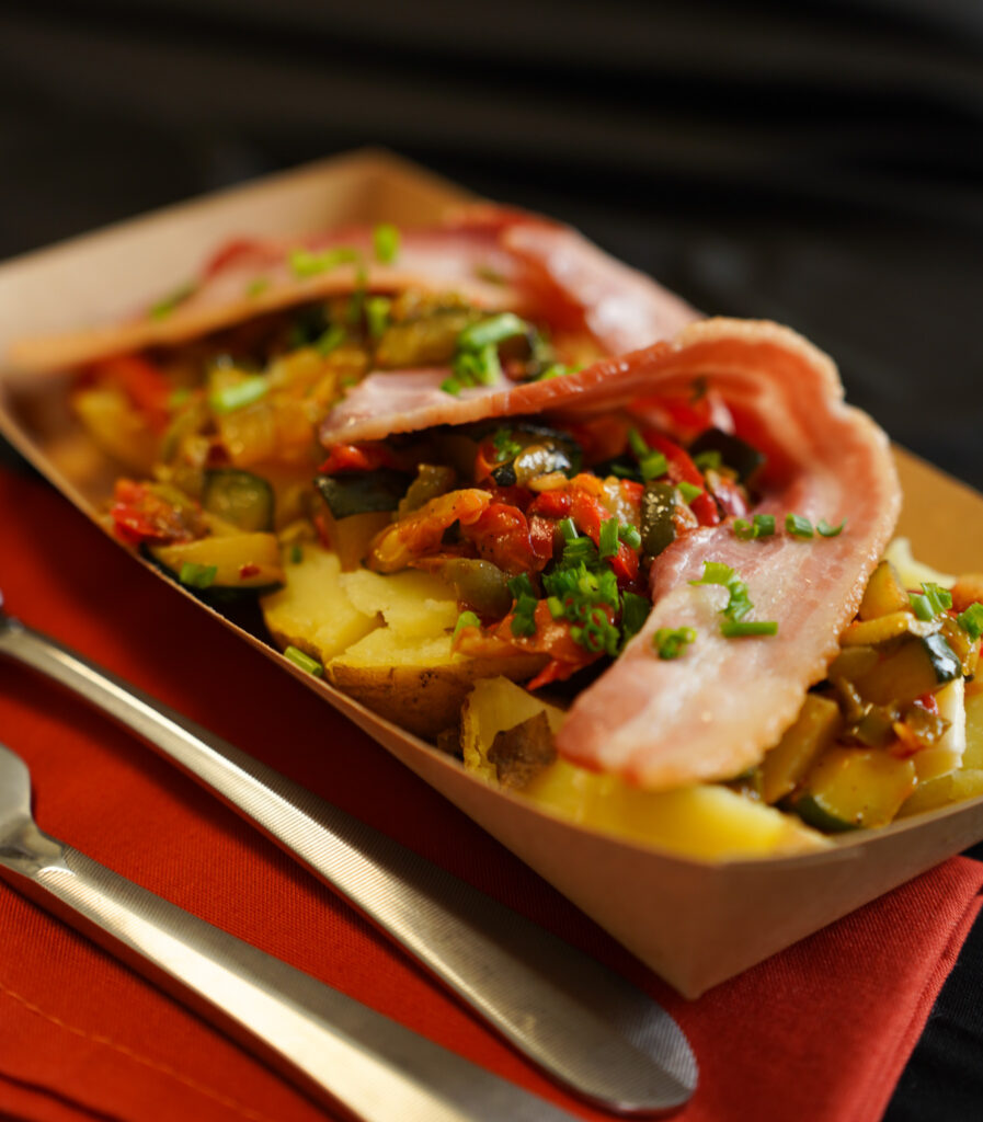 - Bacon Courgette : pommes de terre, bacon, courgette, poivron rouge, emmental mozza.