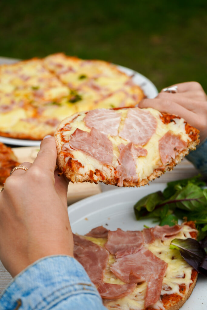 - Jambon : Sauce tomate, emmental, mozzarella, jambon.