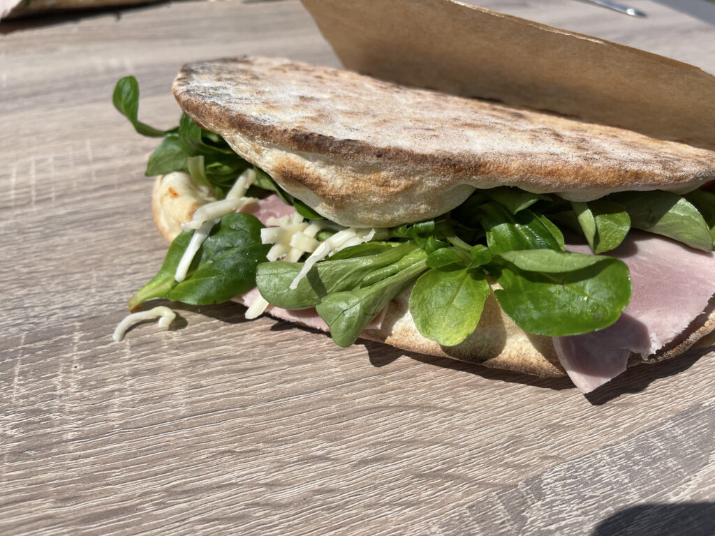 - Le Geno’ : Pesto, poulet, emmental, mozzarella, mélange mâche roquette.